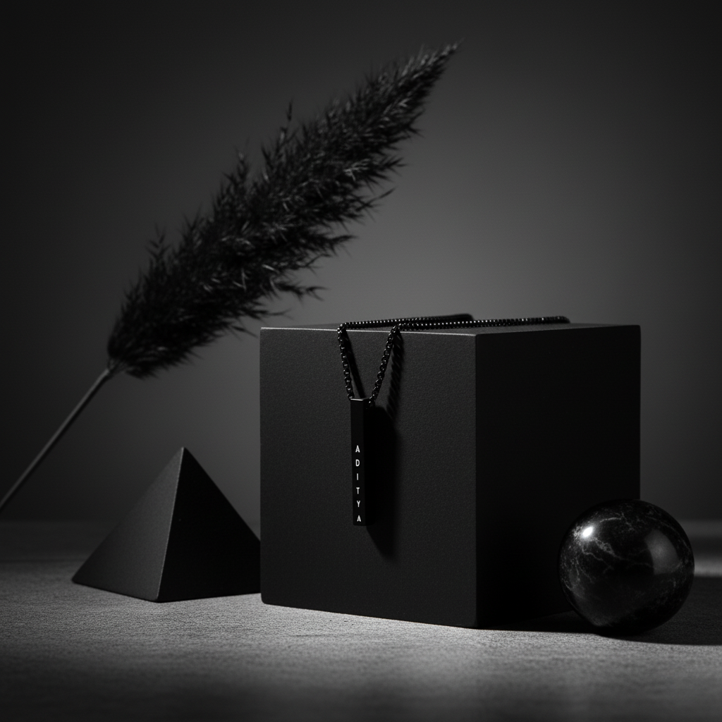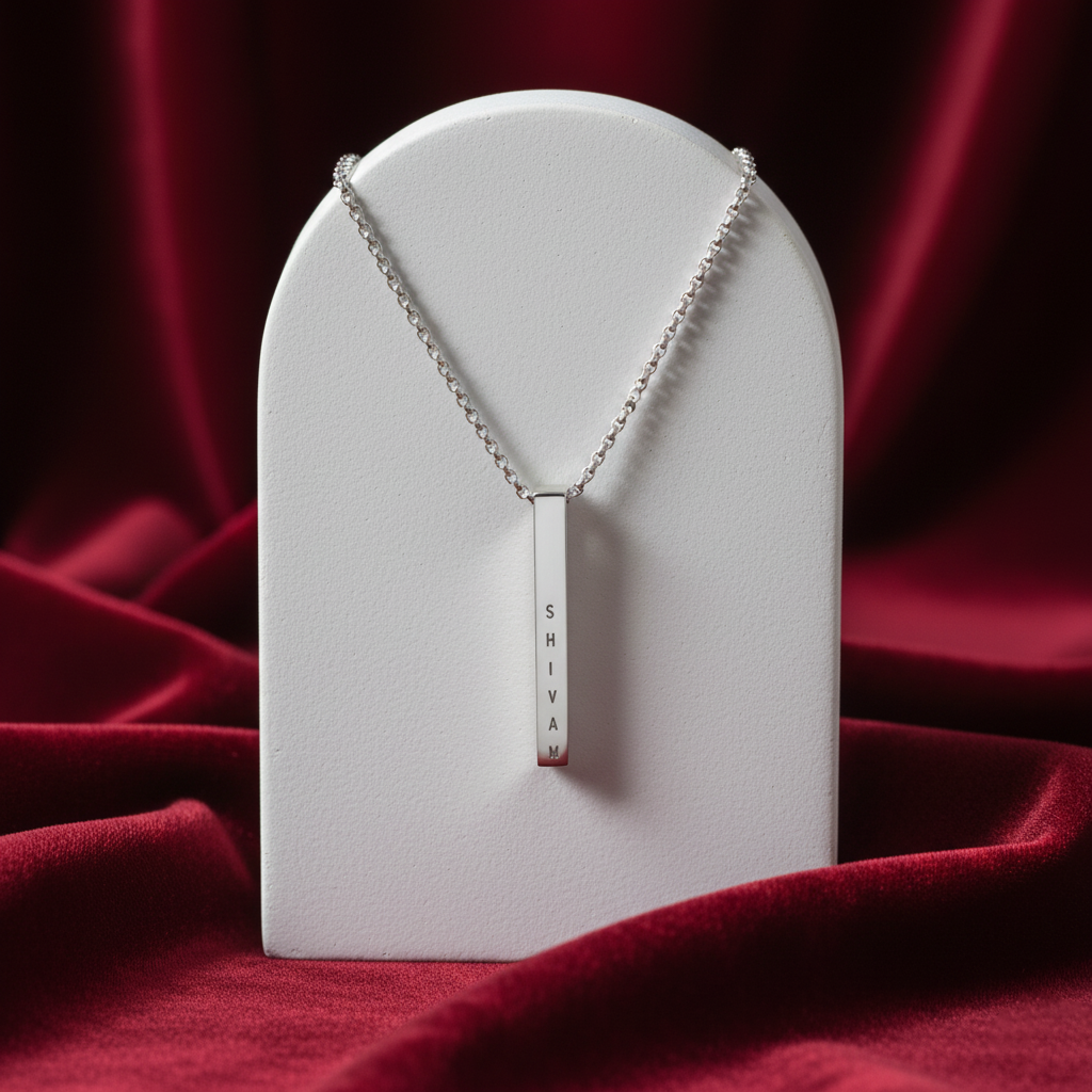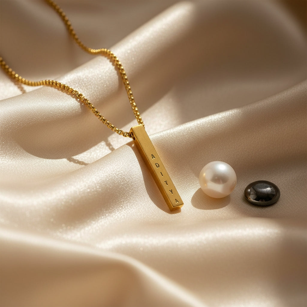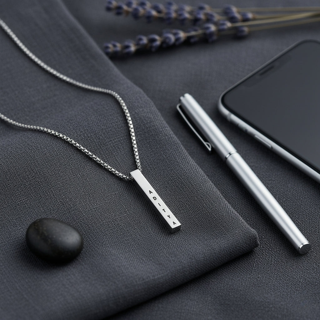 Your Name, Your Message, Your Way with Bliss Blue: The sleek, minimalist bar pendant features a sophisticated matte finish, providing a modern and understated luxury feel. What truly sets it apart is the power of personalization: customize it with any name, initial, special date, or meaningful word that resonates with you. Whether it's "ADITYA" as shown, your own name, or a secret mantra, make this Bliss Blue piece uniquely yours.
