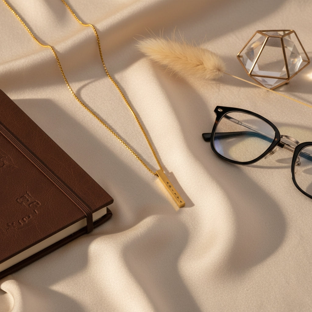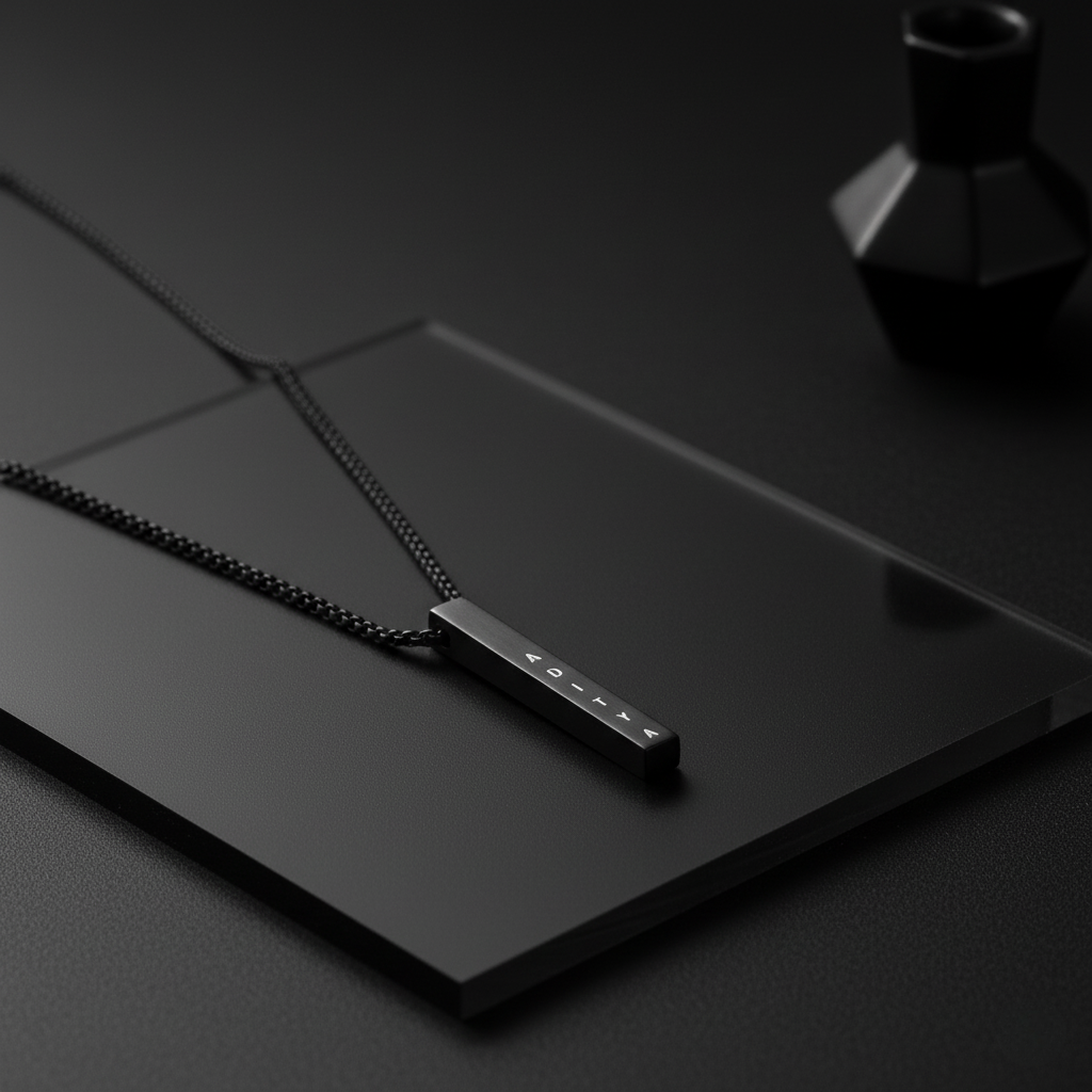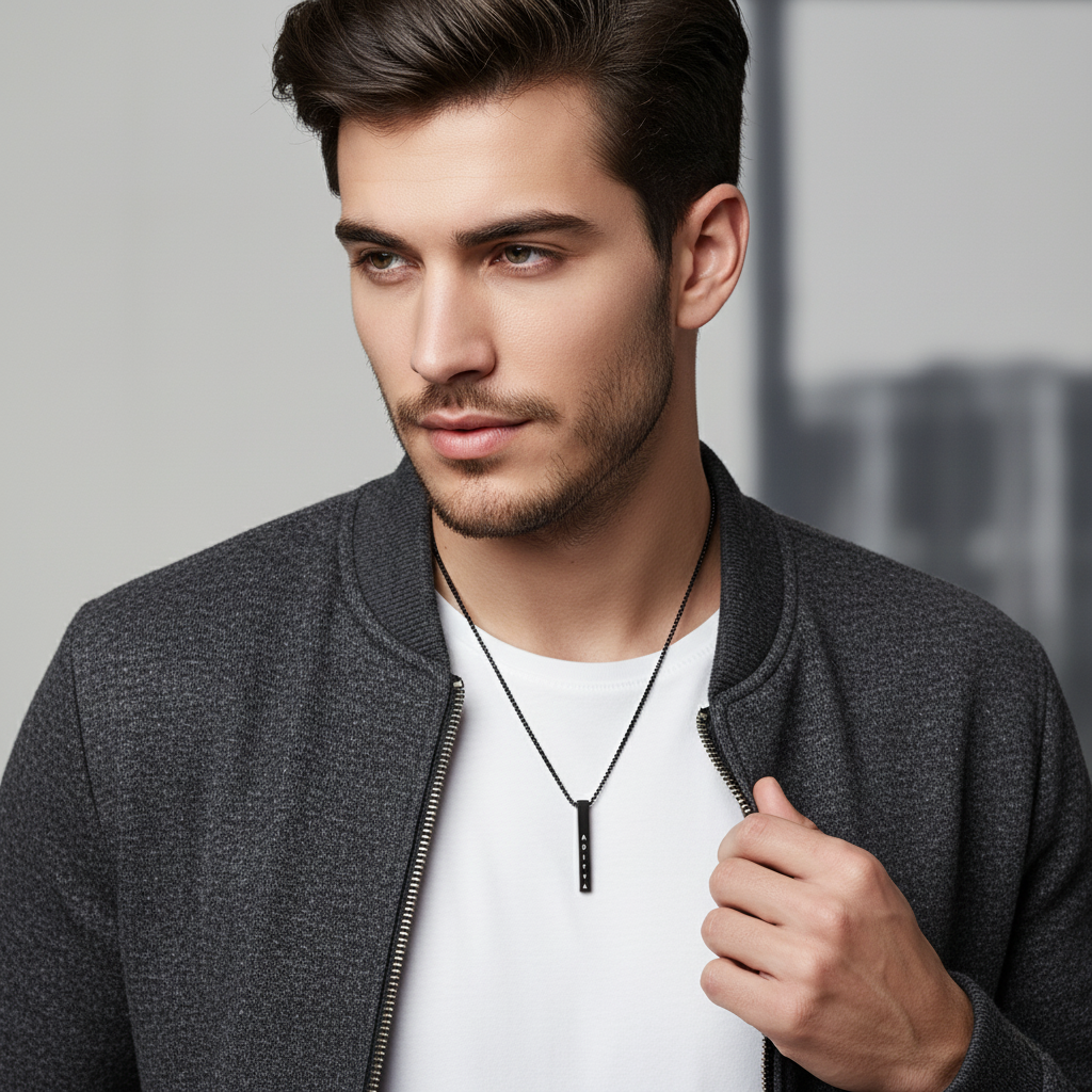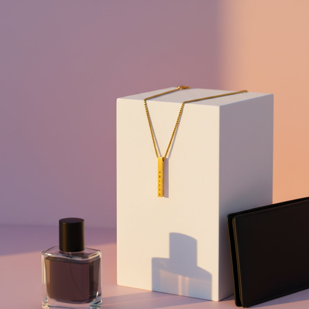 Your Name, Your Message, Your Way with Bliss Blue: The sleek, minimalist bar pendant features a sophisticated matte finish, providing a modern and understated luxury feel. What truly sets it apart is the power of personalization: customize it with any name, initial, special date, or meaningful word that resonates with you. Whether it's "ADITYA" as shown, your own name, or a secret mantra, make this Bliss Blue piece uniquely yours.